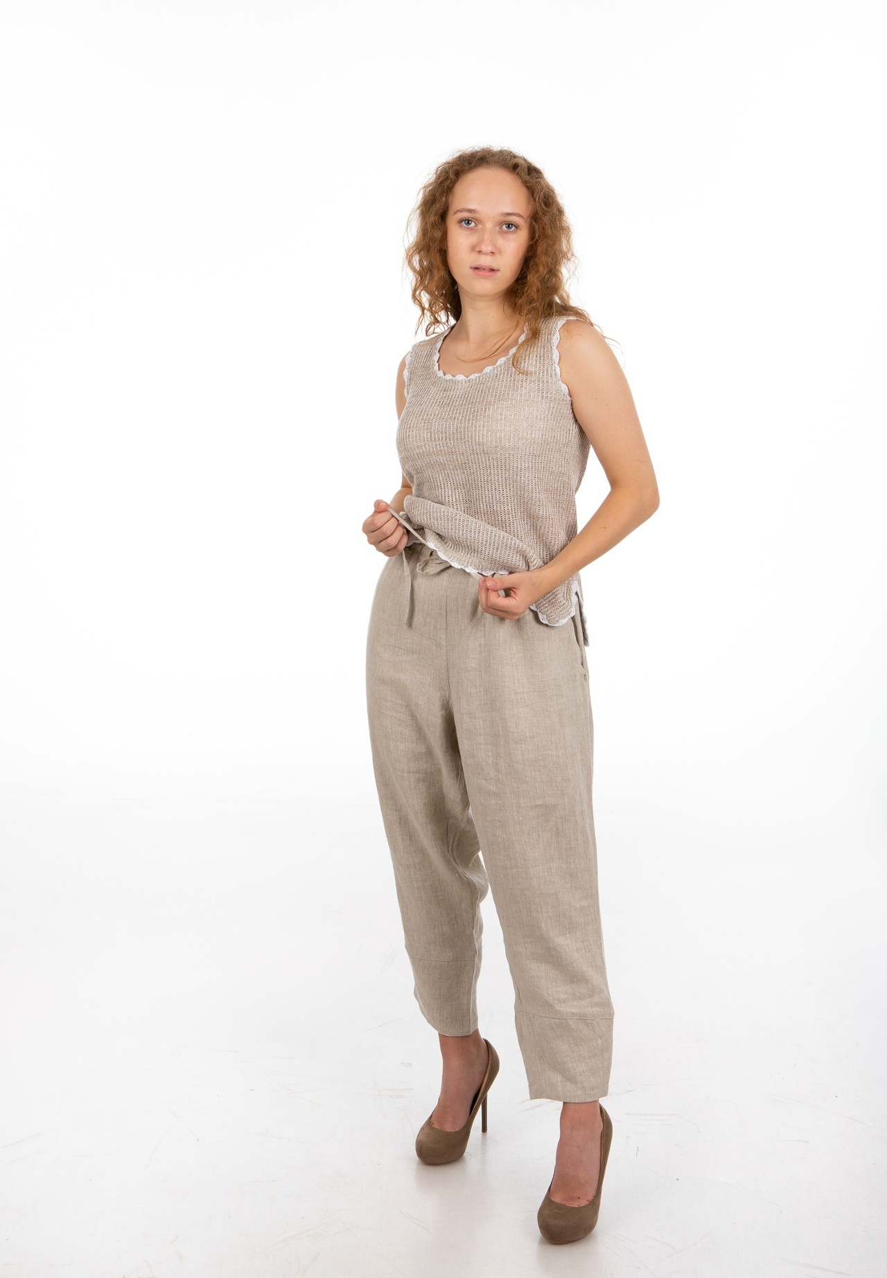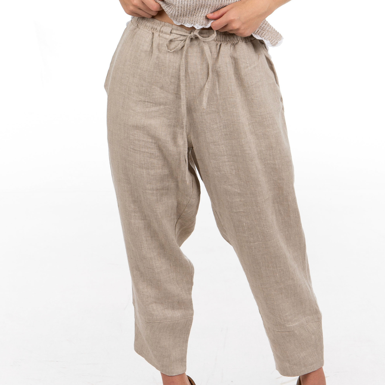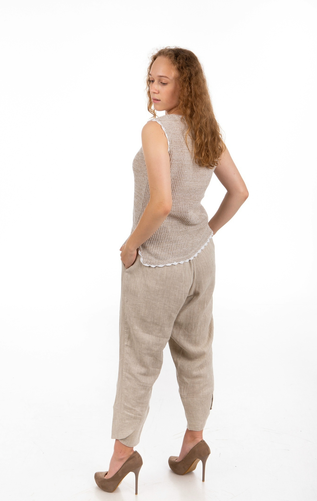 Бриджи льняные с манжетом (серые), зауженные книзу. Пояс на резинке с завязками. Размеры: 44-56. Лён 100%. Длина: 90 см. Состав- Лён 100%.