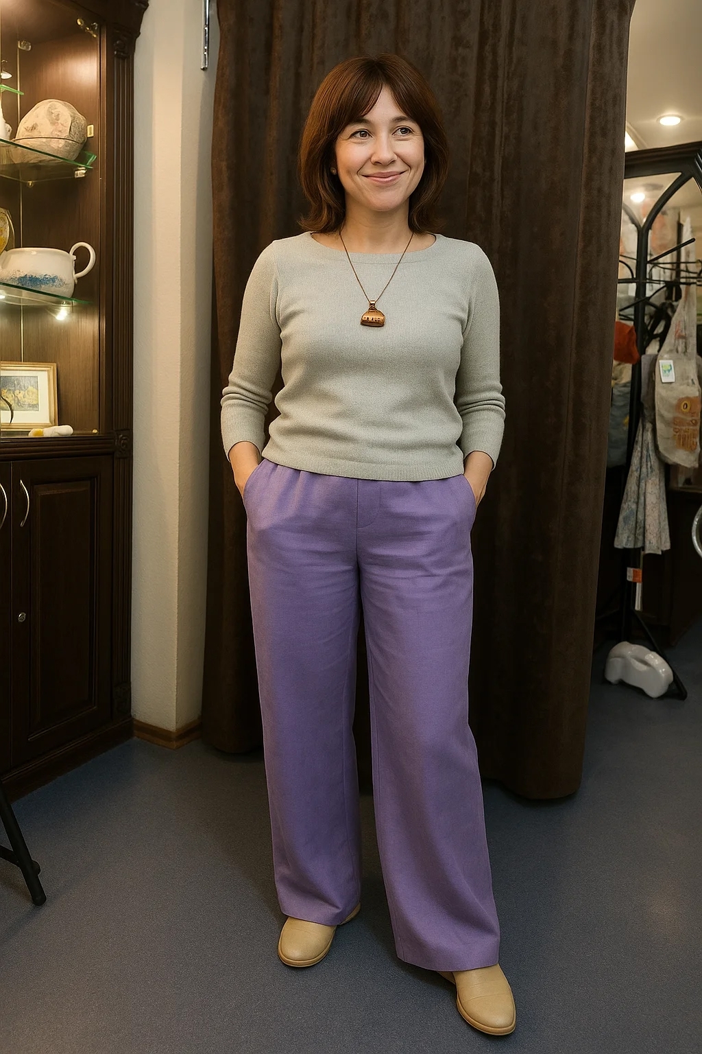 Лаконичные брюки- палаццо из 100% льна в сиреневом оттенке. Свободный силуэт визуально удлиняет линию ног и добавляет образу легкости. Натуральный лен позволяет коже дышать и сохраняет форму в течение дня. Сочетаются с топами, жакетами или рубашками в тон, создавая сбалансированные комплекты. Подойдут как для городских прогулок, так и для отпуска. Брюки женские льняные -палаццо, на резинке, имеются внутренние карманы. Переплетение- саржевое (диагональ). Размеры: 44-46, 48-50, 52-54, на рост 165+/- 5 см.