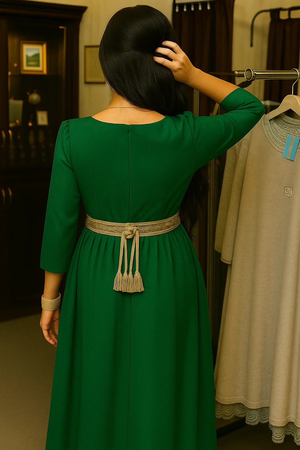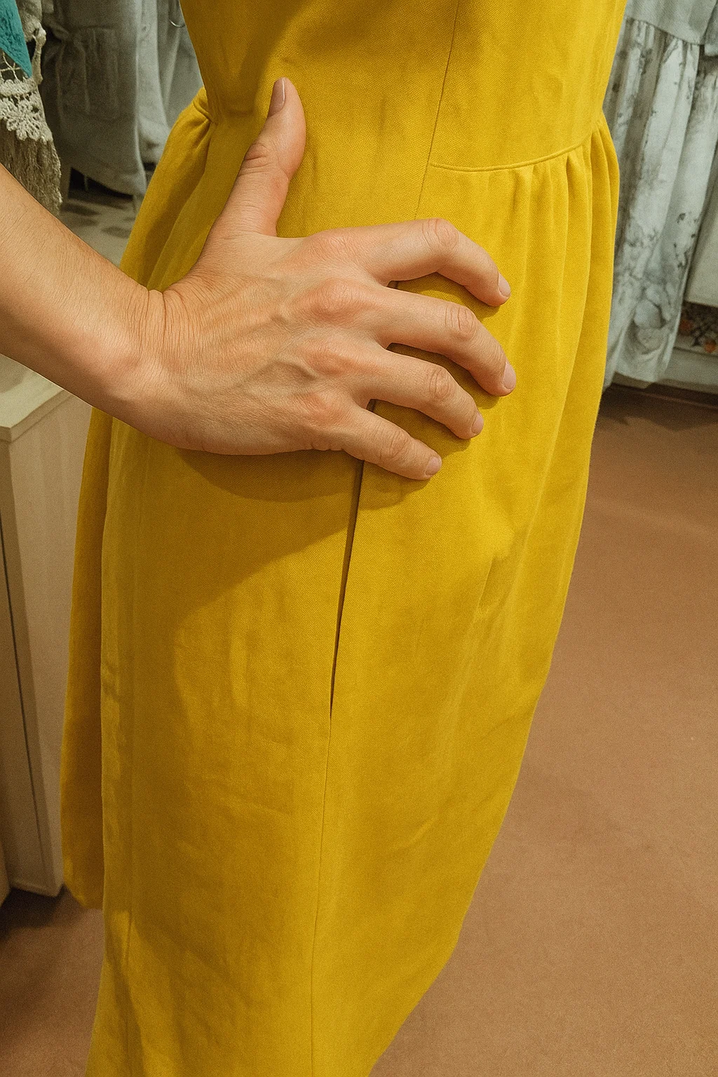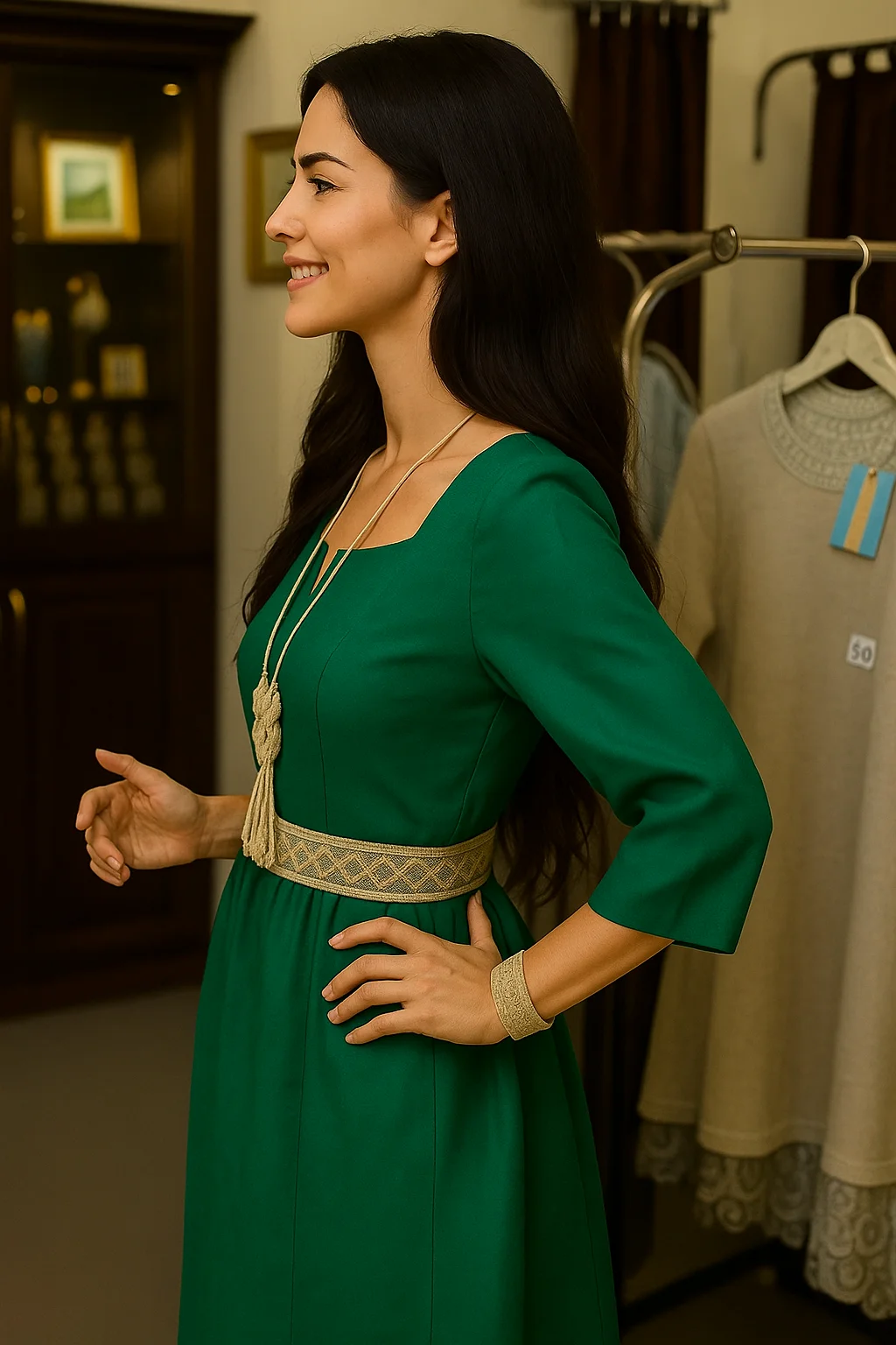 Платье полуприталенное, изготавливается из ткани следующих расцветок: «горчица», «зелёный», «коричневый», «терракотовый». Рукав 3/4, оформлен манжетом. Горловина оформлена в виде галочки. Платье отрезное по талии, в средней части спереди и сзади небольшая сборка. Карманы возможны в двух исполнениях: в рельефе и в боковых швах. Состав: лён 100%.