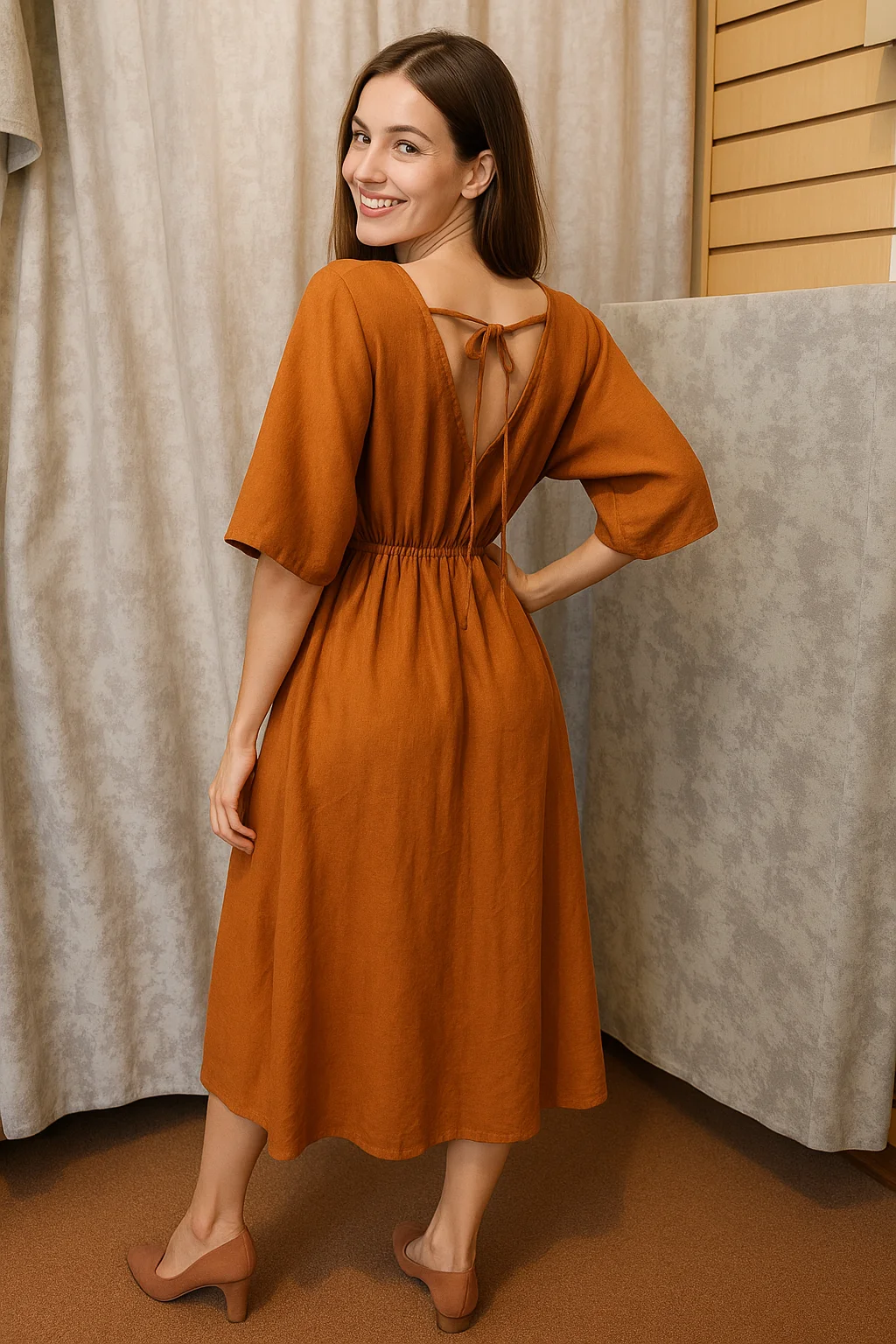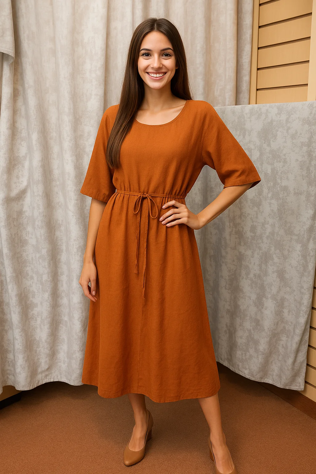 Платье из 100 % льна. Рукав 3/4. С поясом. Длина ниже колена. Спинка оформлена V-образным вырезом со шнуровкой. Размеры 44-54.