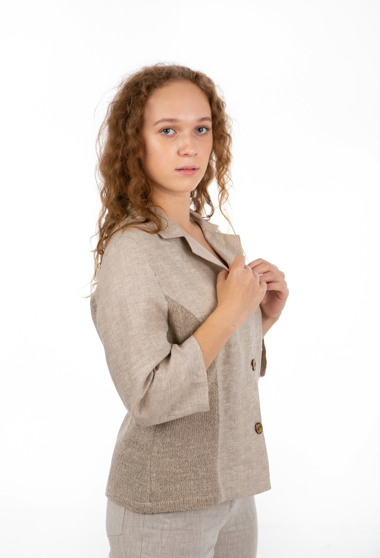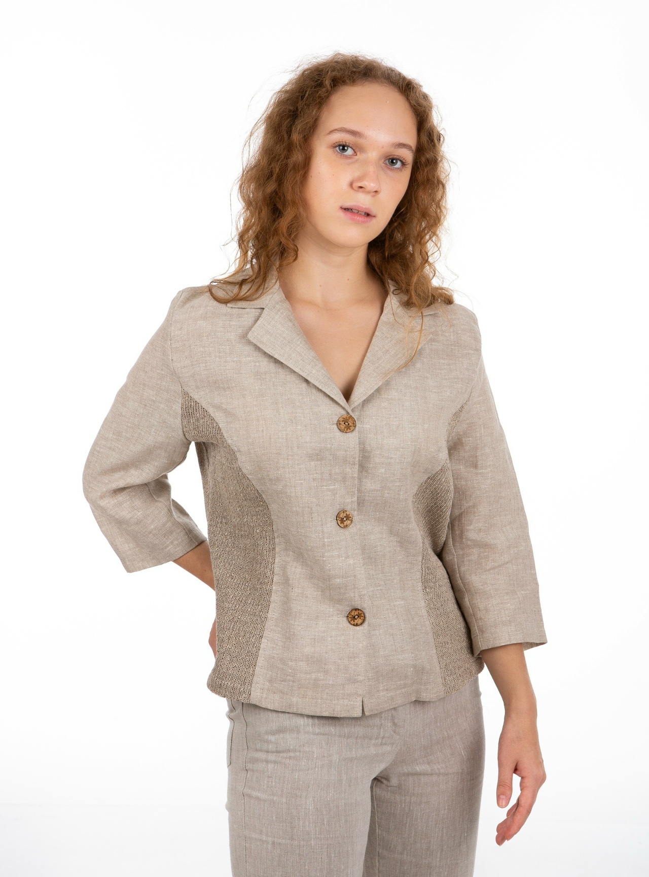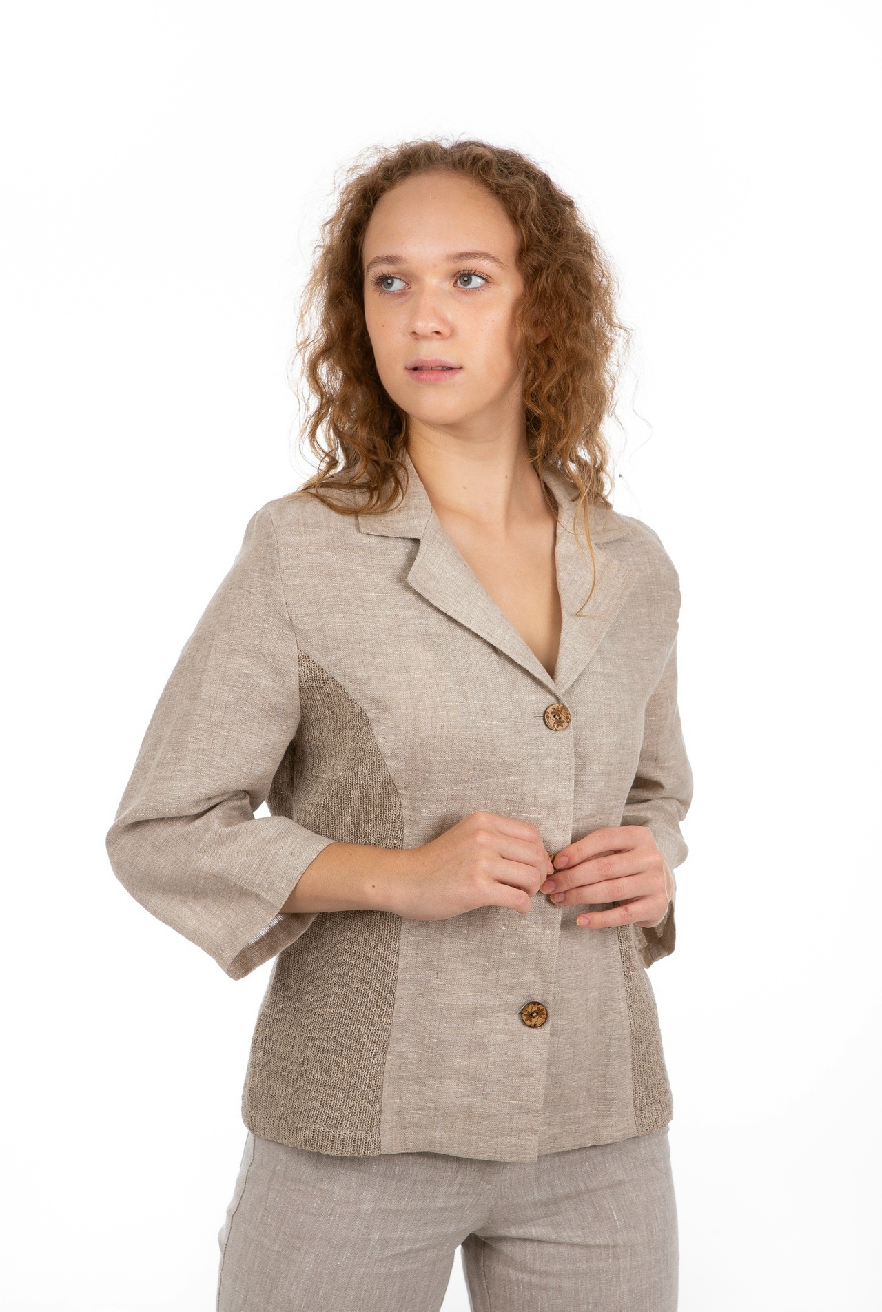 Жакет комбинированный льняной серый, с боковыми трикотажными вставками. Пуговицы из скорлупы кокосового ореха, рукав 3/4. Отложной воротник. Размеры: 44-54. Состав- Лён 100%.